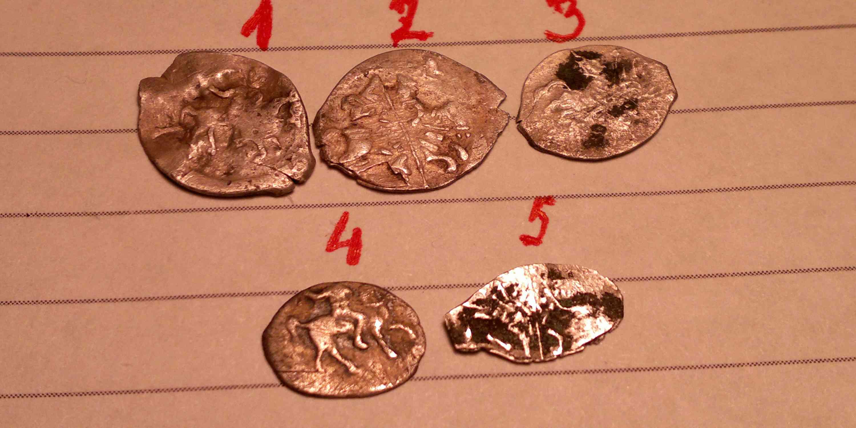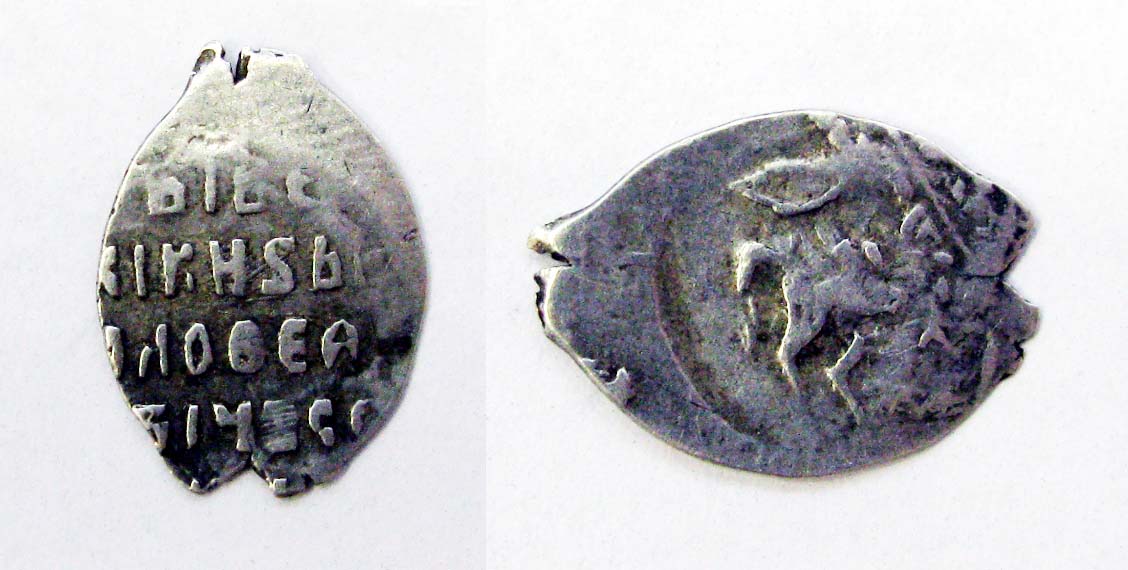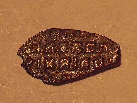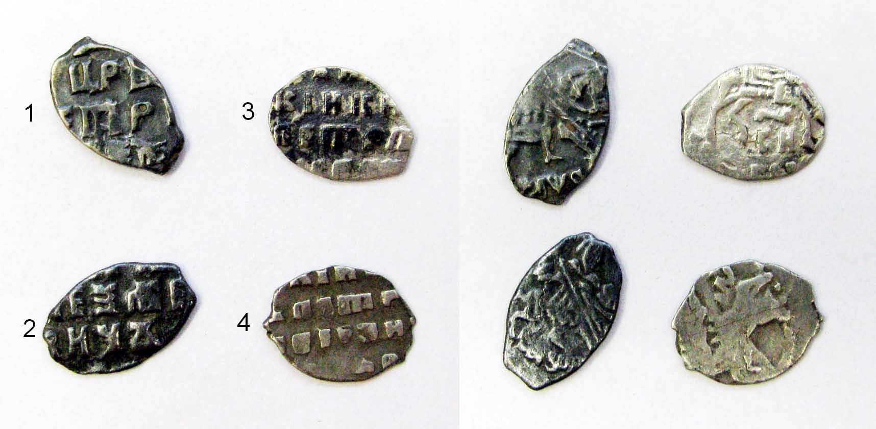 1. Сабельная копейка Иван Грозный, 1535 -- 1538 гг.; 2. Лжедмитрий, 1605 -- 1606 гг.; 3. Кто-то из Алексеевичей, по такой монете затрудняюсь сказать; 4. Денга Ивана Грозного.; 5. Петр Алексеевич, |