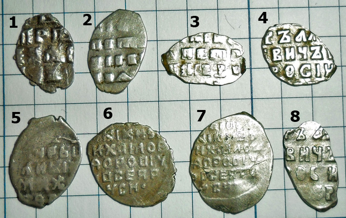 QUOTE(infinity_Ob @ Dec 5 2011, 18:54) Специалисты, прошу атрибутировать немного чешуи (есть ли редкие) и дать оценку? Я так думаю, что 1-3 - Петр, 5-7 - Михаил Федорович. 4 и 8 может быть тоже Михаил Федорович. Цена скорее всего символическая. Прав, нет? Заранее спасибо. Редких нет. 4 и 8 Пётр, остальное всё верно. -------------------- новый каталог по царской чешуе