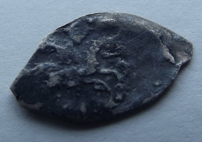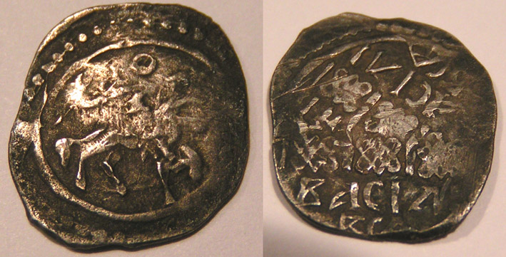 Имеется такая монета, предположительно Борис Константинович, Полуденга 0.39гр. Аналога не найдено, научного обоснования принадлежности нет. Имеется экспертное заключение ГИМ.