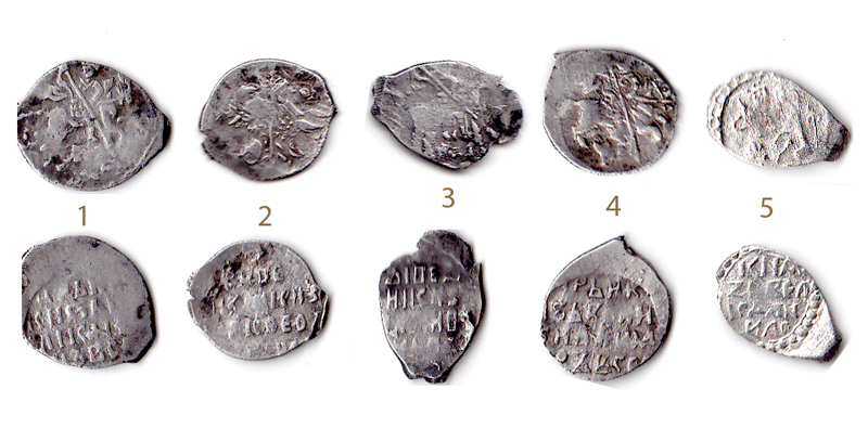 QUOTE(west-krasnodar @ Nov 2 2012, 20:28) Добрый вечер. Есть пять неопределенных монет. Очень надеюсь на Вашу помощь в определении и оценке стоимости. Заранее благодарен ответившим. Спасибо! 1. Иван Грозный, Новгород; 2 Борис Годунов; 3 Михаил Федорович; 4 Федор Иванович; 5 Даниил Борисович, Нижний Новгород, тип "удушение зверя". -------------------- Куплю бронзовые замочки "лошадки" 14-15 вв. (половинки и целые) . Предложения в личку.