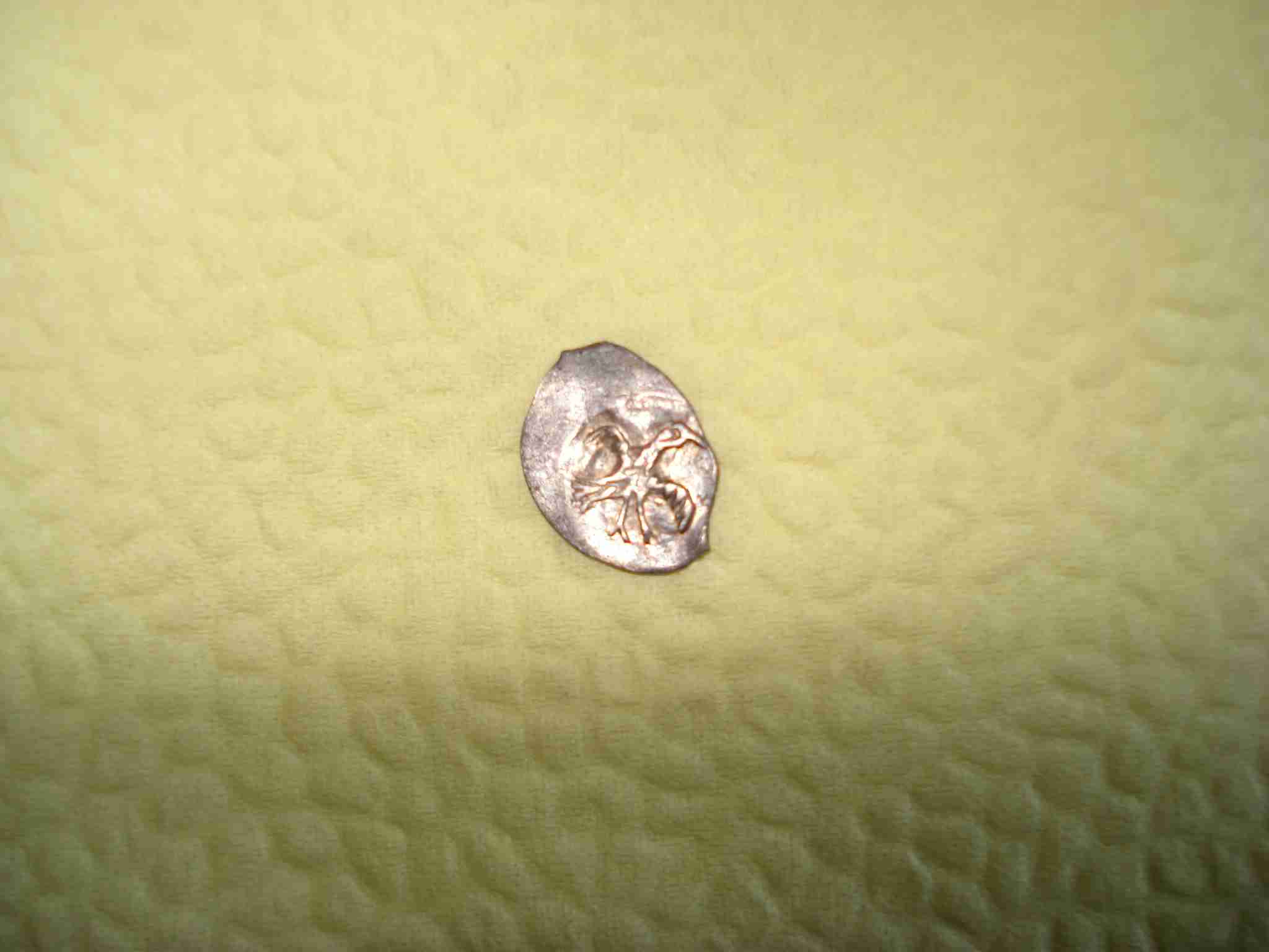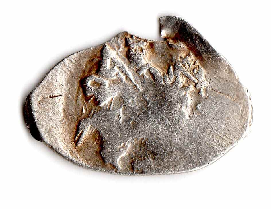 Хотелось бы узнать, сколько может стоить эта чешуйка. dnvn определил ее как очень редкую копейку Иоанна Алексеевича: № 1538 в каталоге Клещинова и Гришина, степень редкости II (чрезвычайно редкая монета). Прорисовка этой копейки в каталоге детализирует нижнюю часть надписи оборотной стороны (видимо, с какой-то монеты). В связи с ее редкостью авторы, предположу, не могли составить более полную картину штемпеля (в каталоге эта оборотка под №16). Моя же копейка дает верхнюю часть, пусть и не полностью.