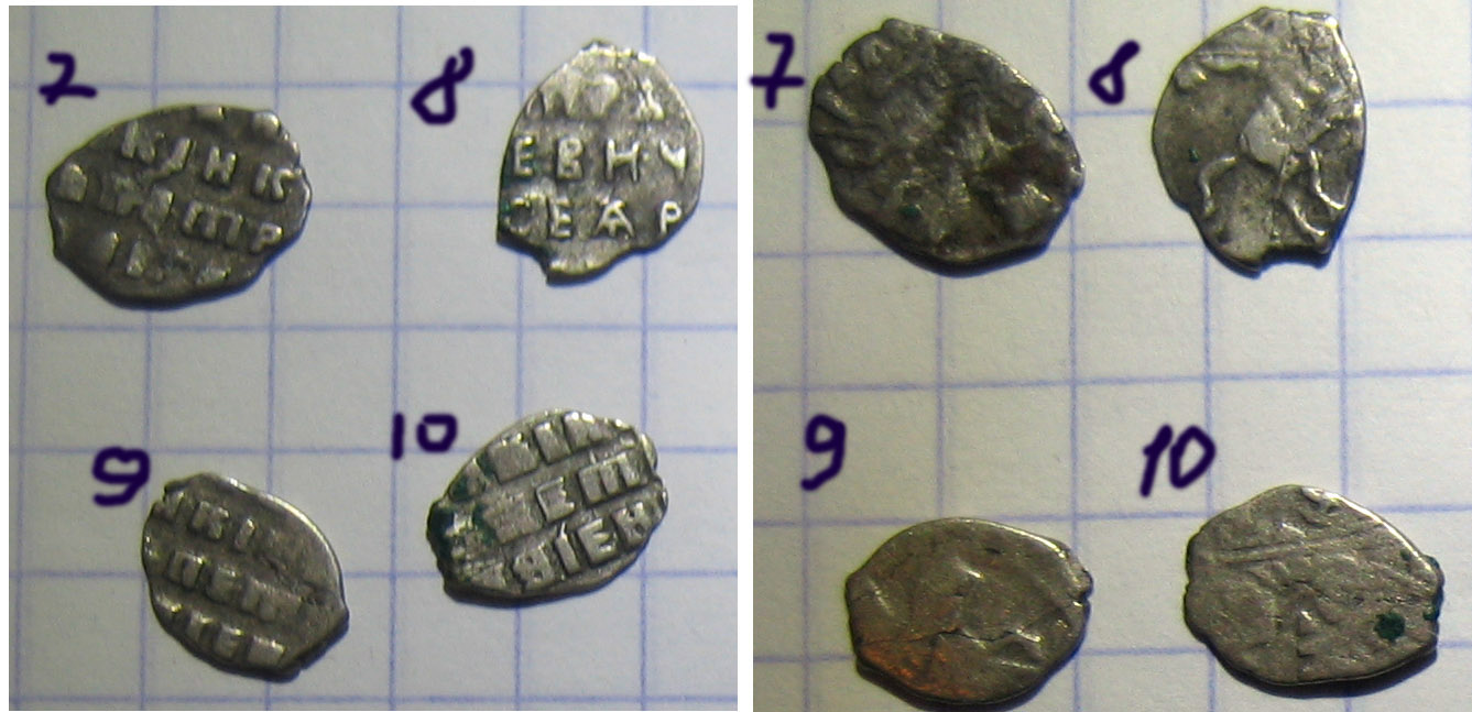 QUOTE(tellur @ Feb 26 2013, 22:24) Помогите пожалуйста в определении следующих монет, есть ли из них какие нибудь редкие? 1 - 4 Петр Алексеевич 5 Михаил Федорович 6 предположу что Мордовка 7 - 10 Петр Алексеевич. -------------------- Куплю бронзовые замочки "лошадки" 14-15 вв. (половинки и целые) . Предложения в личку.