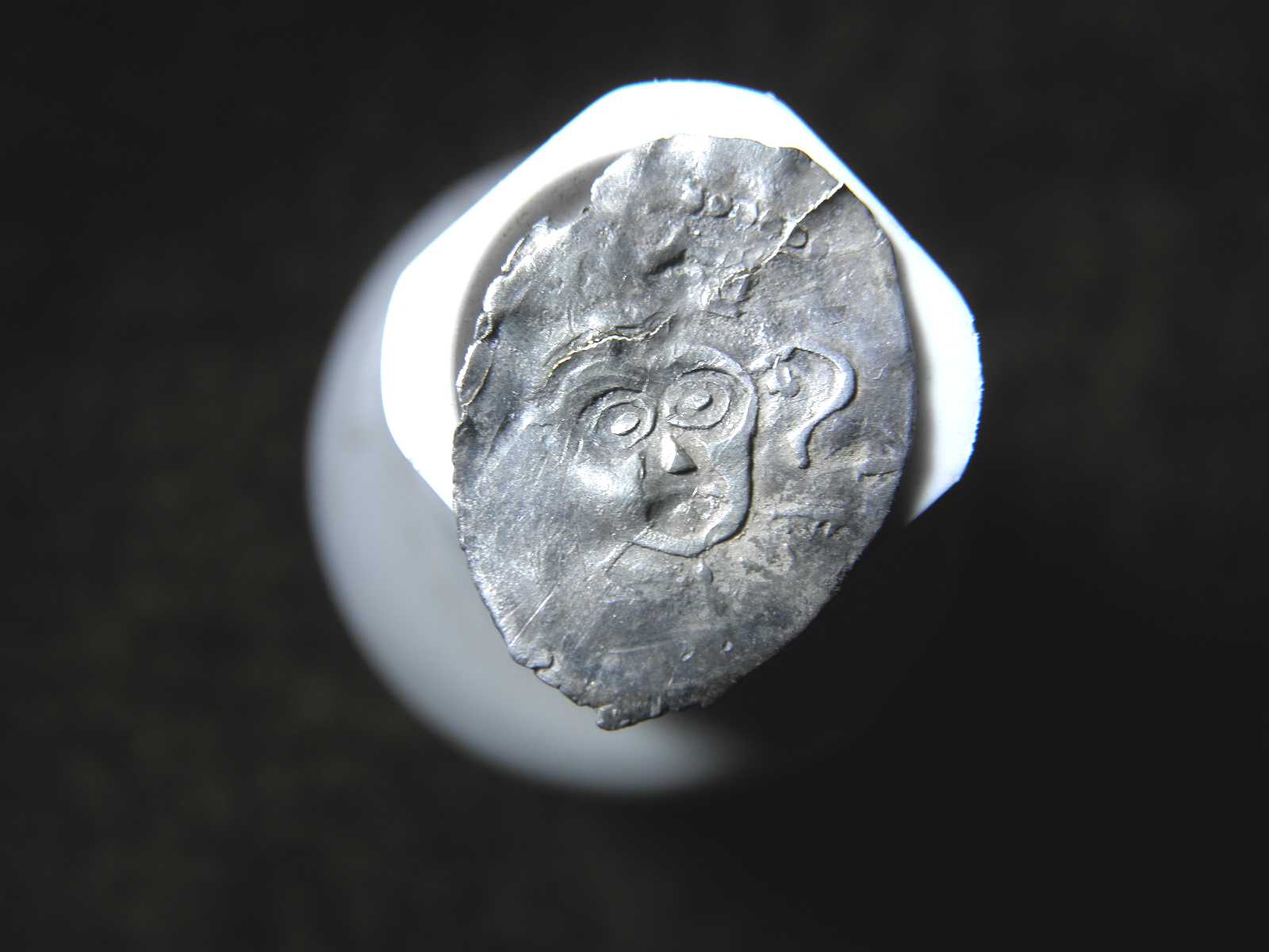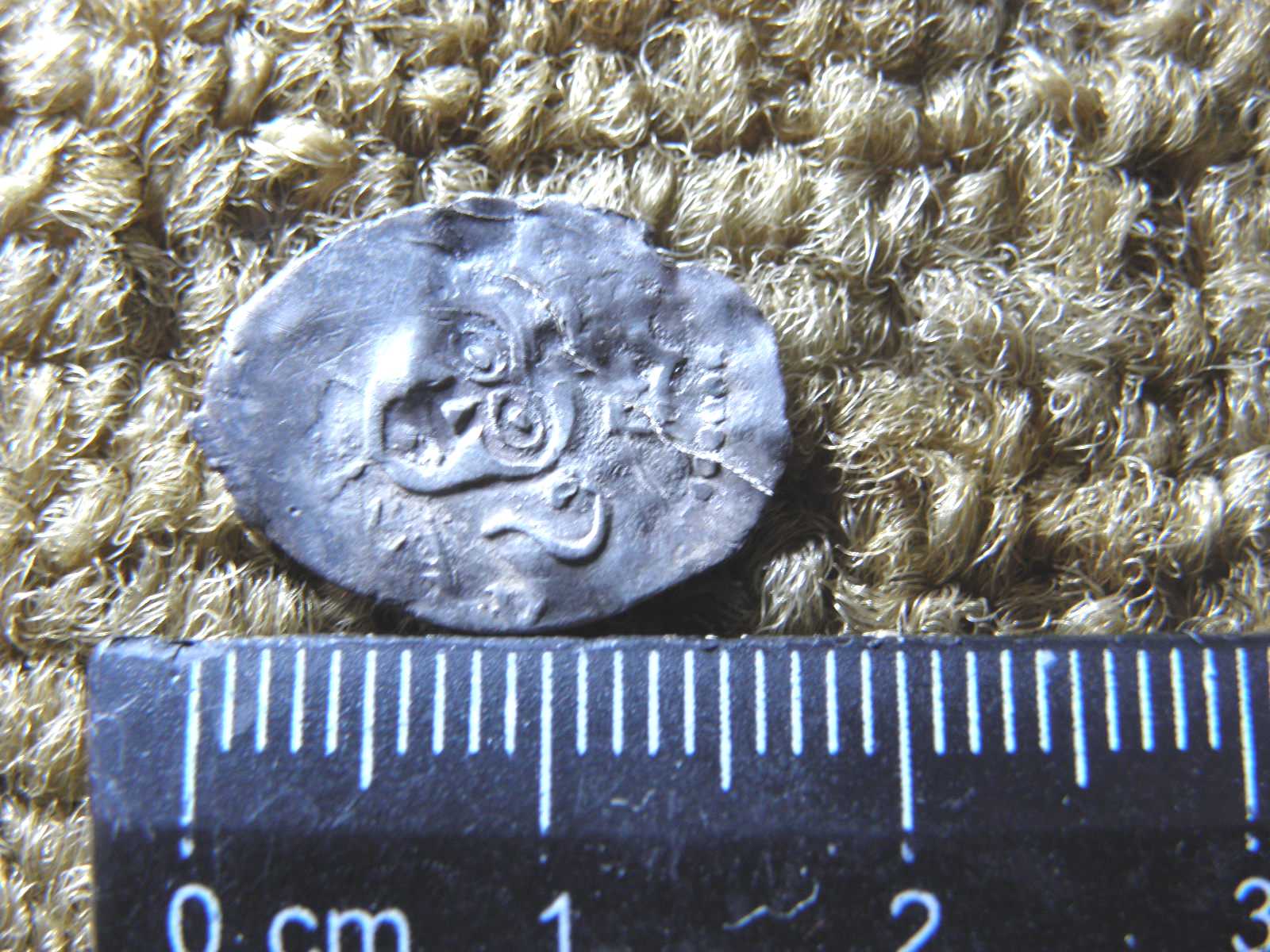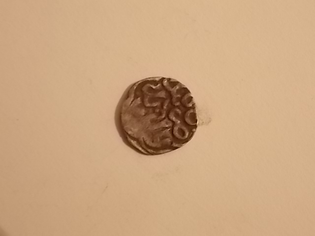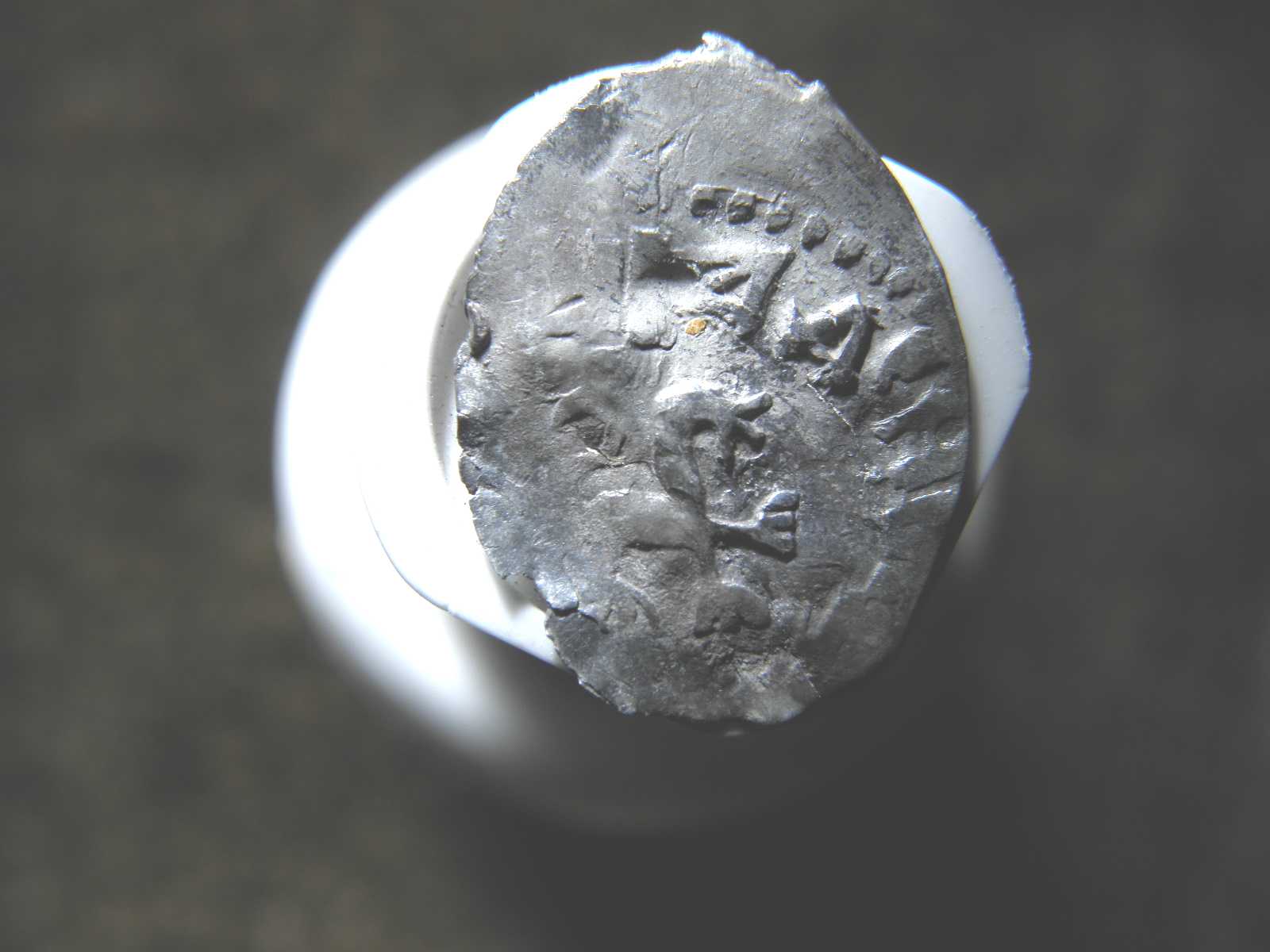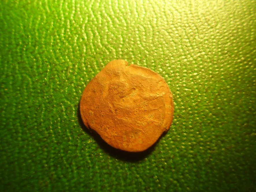 Помогите, пожалуйста, определить. Хотя понимаю, что в таком состоянии... Вопрос принципиальный - найдена была почти случайно при поиске империи на исторической родине моих предков (заселение произошло около 1700г). Видятся : снизу-две ноги коня, посередине-часть руки и копья, вверху-голова в короне. Вроде. Вес - 0,21 г. Размер - 10*8 мм. Хотя бы временной интервал и царя. Без разновида. Заранее благодарен.