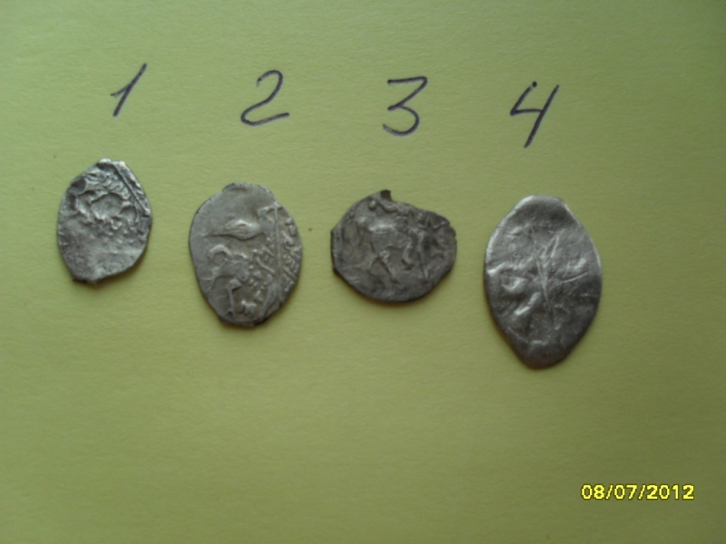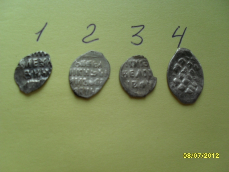 QUOTE(Алёша Попович @ May 25 2013, 17:13) Прошу помощи в определении и оценке данной чешуи. 1-коп.ПЕТРА I,1701,Кадаш.ден.двор;2-мос.коп.Мих.Фед-ча;3-мос.денга Ив.Гроз.;4-его же новгор.коп. |