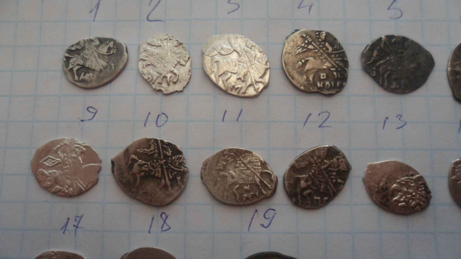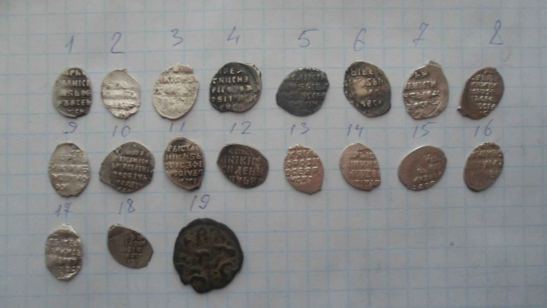 QUOTE(Roond @ Jan 26 2014, 09:43) По порядку: 1. Копейка Федора Годунова, КГ236 (VIII ст. редкости). 2. Московская копейка. 3. Второе земское ополчение, копейка с именем Михаила, КГ320 (VIII ст. редкости). 4. Новгородская копейка Бориса Годунова, КГ209. 5. Новгородская копейка Ивана Грозного, КГ83 (IX ст. редкости). 6. Второе земское ополчение, копейка с именем Михаила, КГ320 (VIII ст. редкости). 7. Московская копейка Федора Ивановича, КГ126. 8. Со слепу не нашел в каталоге, возможно фальшак под московскую копейку Михаила Федоровича? Подскажите, так ли. 9. Второе земское ополчение, копейка с именем Михаила, КГ323 (IX ст. редкости). 10. Московская копейка Василия Ивановича Шуйского, КГ252. 11. Новгородская копейка Бориса Годунова, КГ232. 12. Псковская копейка Василия Ивановича Шуйского, КГ266 (IX ст. редкости). Дальше все неинтересное и убитое ))) 13. Копейка Михаила Федоровича. 14. Копейка Алексея Михайловича. 15. Копейка Михаила Федоровича. 16. Копейка Алексея Михайловича. 17. Копейка Михаила Федоровича. 18. Копейка Михаила Федоровича. Вообщем ничего особенного, №3, №6, №9, - по состоянию мягко говоря "неважны". №8-Ярославская копейка КГ 797 |