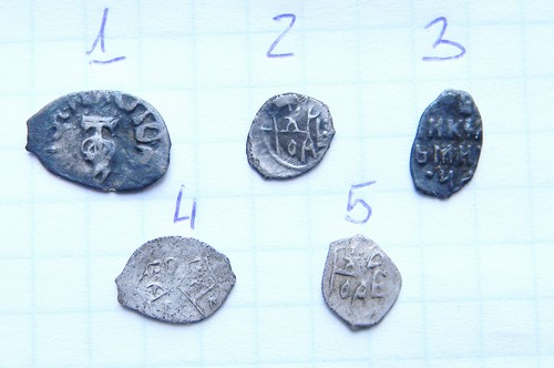 QUOTE(Ruslikxx @ Mar 5 2014, 16:09) Уважаемые знатоки чешуек, помогите определить и оценить данные чешуйки 1 - тверская деньга, по моему Ивана III (Зайцев №56) 2,4,5 - полушки Ивана Грозного КГ98 3- видится что-то Михаила Федоровича цена думаю не велика |