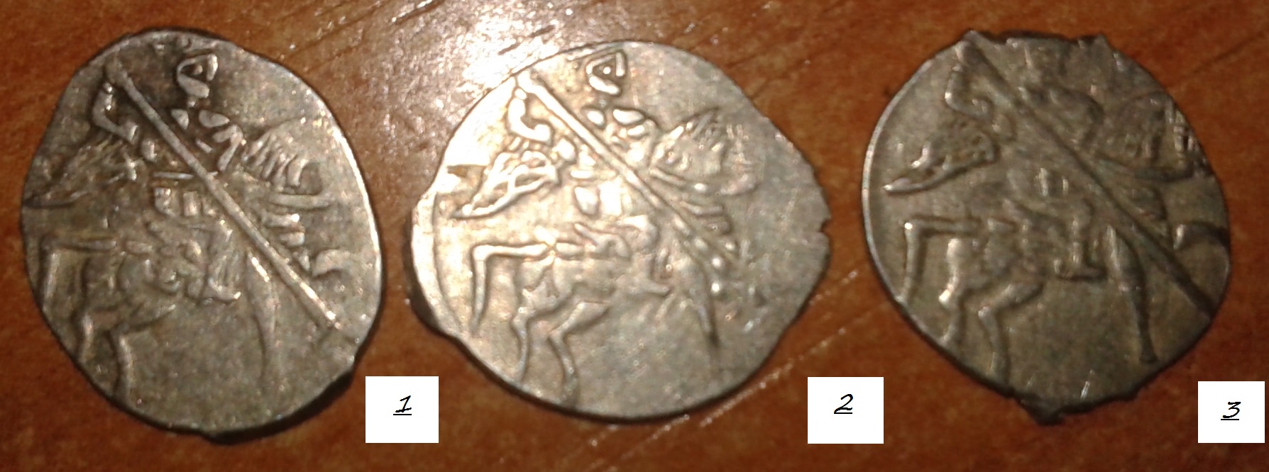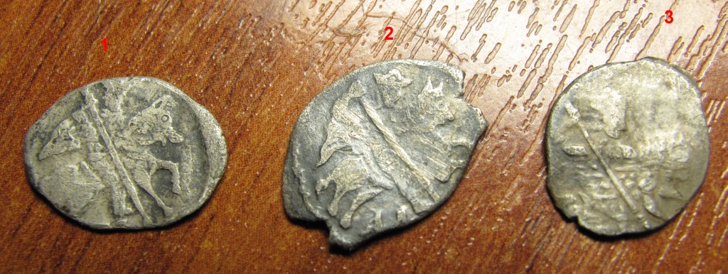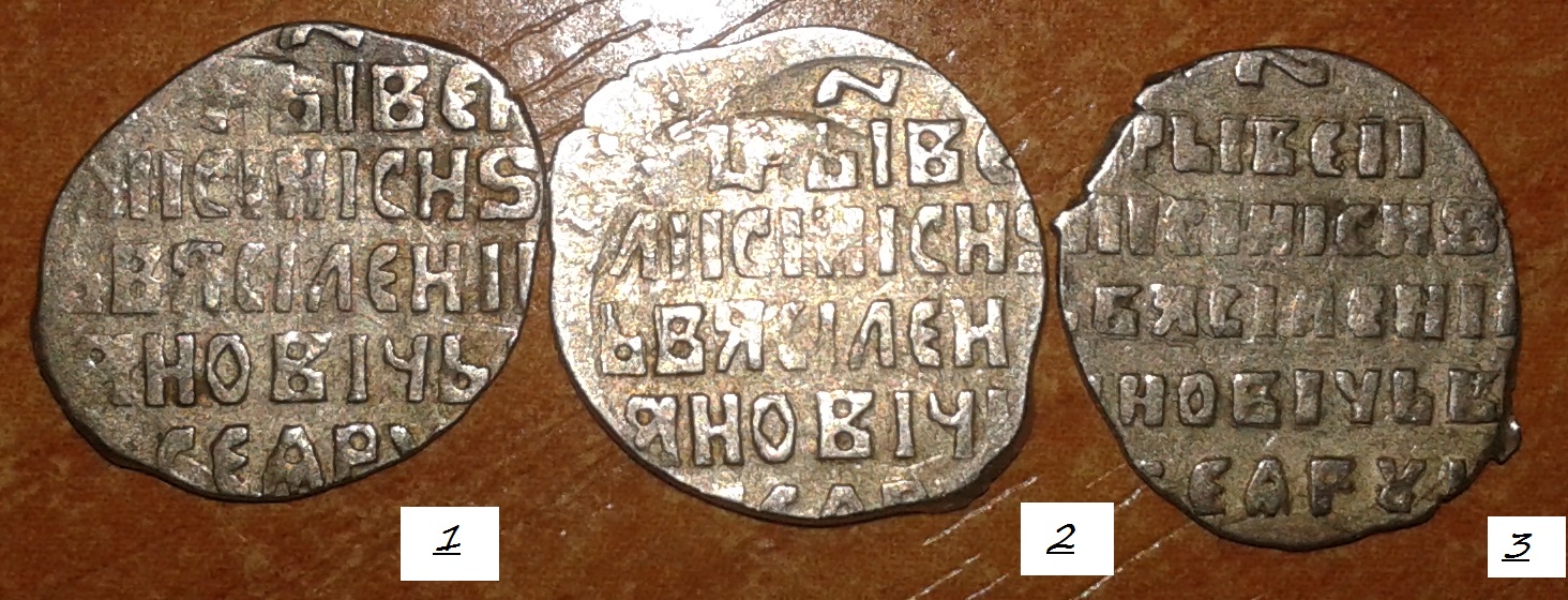 условие задачи: есть три копейки Василия Шуйского - лицевая сторона у всех трех одинаковая! оборотная на первых двух одинаковая, на третьей другая! в каталоге Клещинова-Гришина таких штемпелей нет!!! лицевой похож на московский № 3, но есть небольшие различия! а оба оборотных отсутствуют!