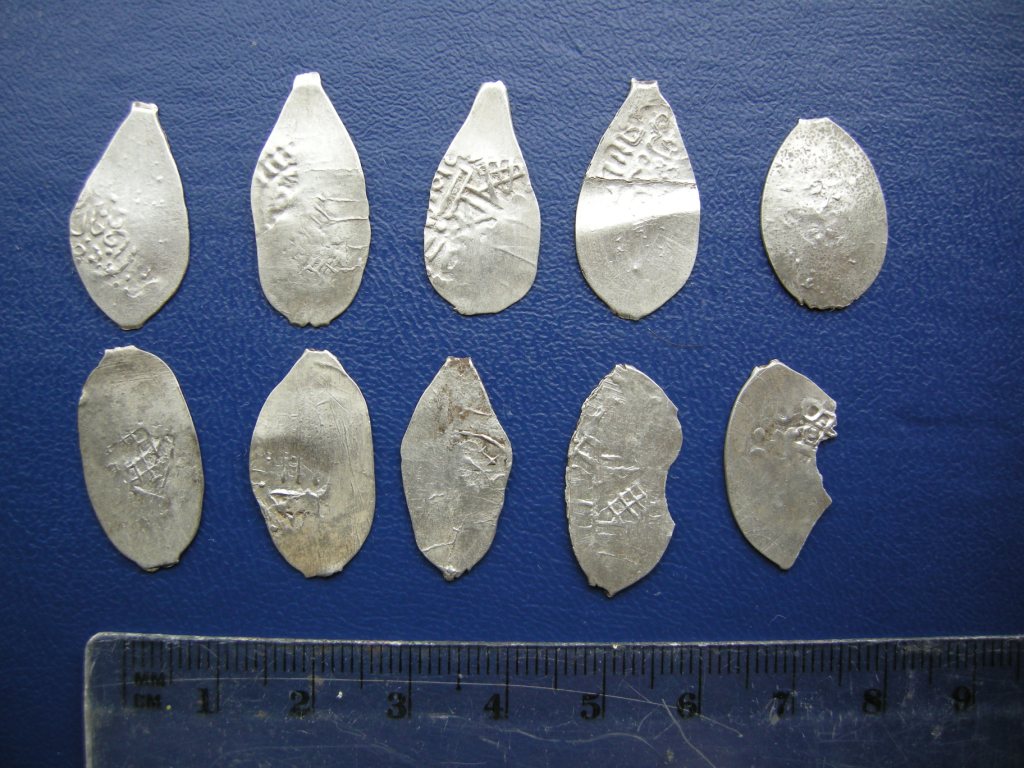 QUOTE(ChavashDigger @ Jul 2 2014, 18:41) Прошу помощи в определении. Очень жаль что состояние убитое, но хочется понять чем являются эти изделия из серебра овальной формы. Общий вес 6,98 г Деньги Суздальско-Нижегородского Великого княжества. Работа, вероятно, периферийных денежных мастерских (типичный набор с характерным для них состоянием). Имитируют как Ордынские данги , так и основные типы русских удельных монет. Конец XIV- начало XV в.в. |