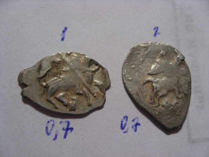 QUOTE(vodoley @ Aug 7 2014, 07:11) 1 - московская копейка Федора Ивановича, № 121 по КГ 2 - новгородская копейка Грозного, № 76 по КГ Спасибо за ответ! |