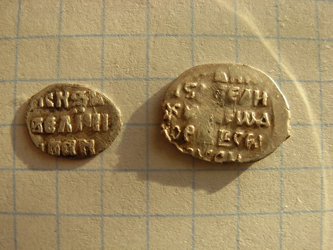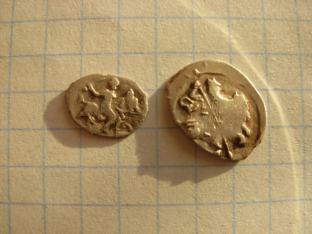 QUOTE(Вишар @ Oct 15 2014, 12:54) Еще пара чешуек на определение и оценку: 1. 2. 1 - деньга Федора Ивановича № 105 по КГ 2 - деньга Грозного -------------------- Человек, который много совершает, и ошибается во многом (Еврипид)