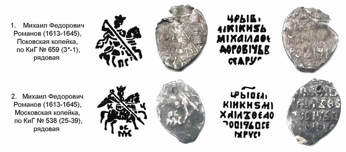 1. Псковская копеечка Михаила Федоровича Романова (1613-1645), по КиГ № 659 (3*-1), рядовая;