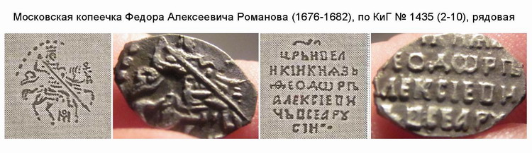 QUOTE(aan @ Jan 11 2015, 23:03) Копеечка Федора Алексеевича Романова (1676-1682), выбита на Московском денежном дворе, по КиГ № 1435 (2-10), рядовая, стоимость для такого состояния составляет ~ 150±20 рублей. Вложенные эскизы изображений -------------------- Знаешь - говори, хочешь узнать - слушай