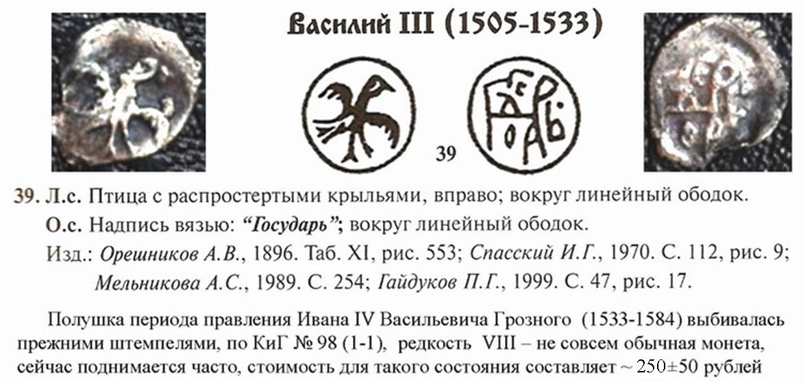 QUOTE(АндерТов @ Jan 18 2015, 01:15) Опишите пожалуйста эту чешую.и какова её стоимость.заранее спасибо! Полушка, отнесенная Зайцевым к периоду правления Василия III (1505-1533) под № 39. Этими штемпелями выбивались полушки и при его сыне Иване IV Васильевиче Грозном (1533-1584), по КиГ это № 98 (1-1), по редкости VIII – не совсем обычная монета, но в последние годы они поднимаются достаточно часто, стоимость на отдачу для такого состояния ~ 250±50 рублей. Сообщение отредактировано Tanais: Jan 18 2015, 12:17 Вложенные эскизы изображений -------------------- Знаешь - говори, хочешь узнать - слушай