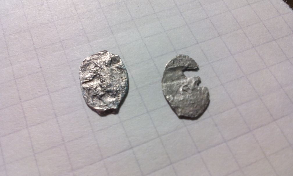 QUOTE(RudikB @ Feb 13 2015, 22:20) Вот незадача... попались впервые чешуйки на копе, и те фиг определить... Публикую скорее не ради идентификации, а чтоб эдакой печалью поделиться. Слева - копейка первых лет правления Алексея Михаиловича(1645-1676), справа - московская копейка середины 20-х - 30-х гг.XVII в.(время правления Михаила Федоровича(1613-1645)). |