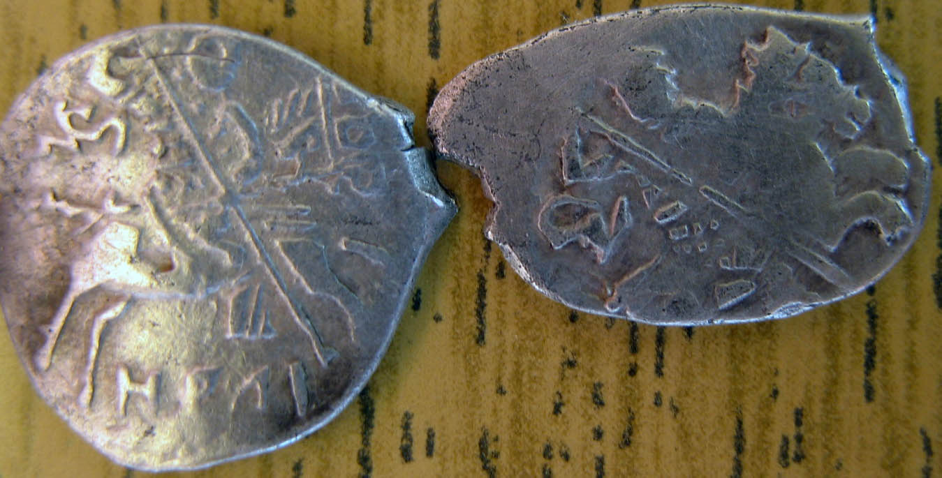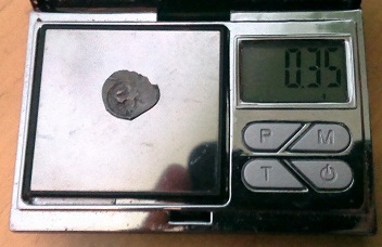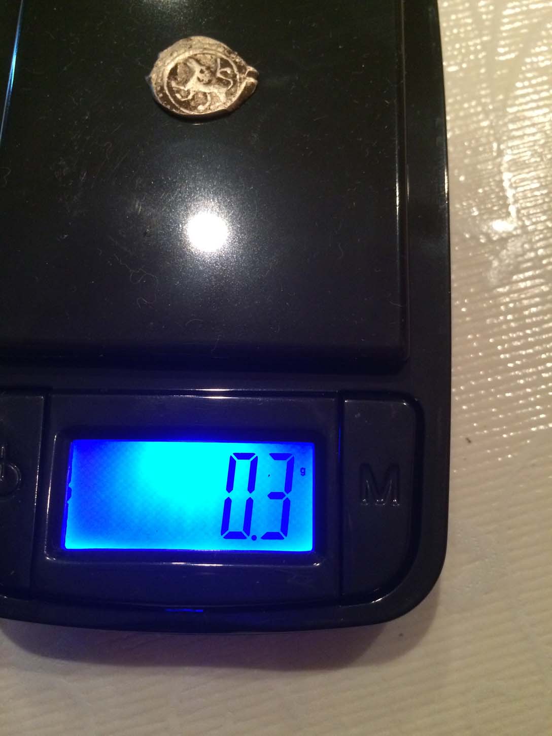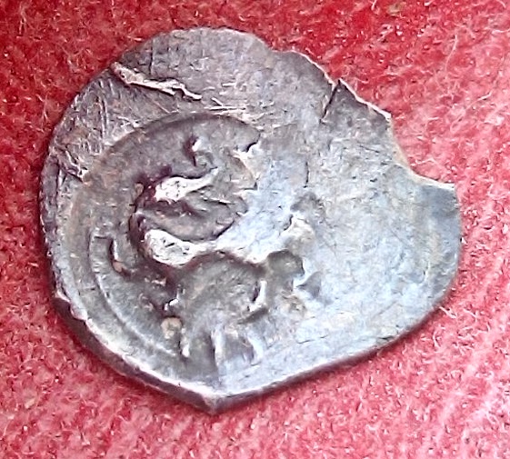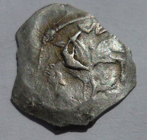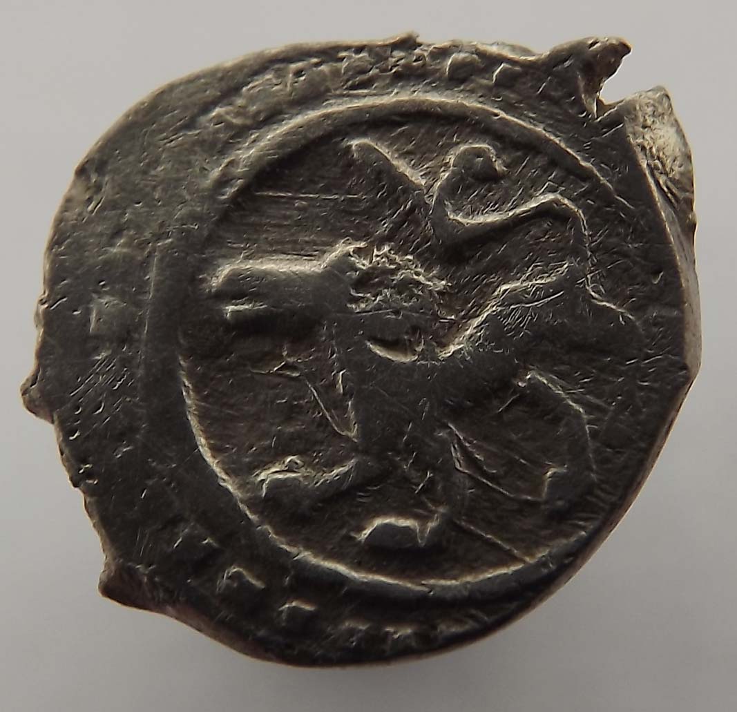 Денга независимого Пскова с изображением правящего князя Довмонта, чекан 1424-1510г., весовая норма 0,71-0,81 гр., по каталогу Д.В.Гулецкого и К.М.Петрунина № 3015 DA, справа от князя буква "с".