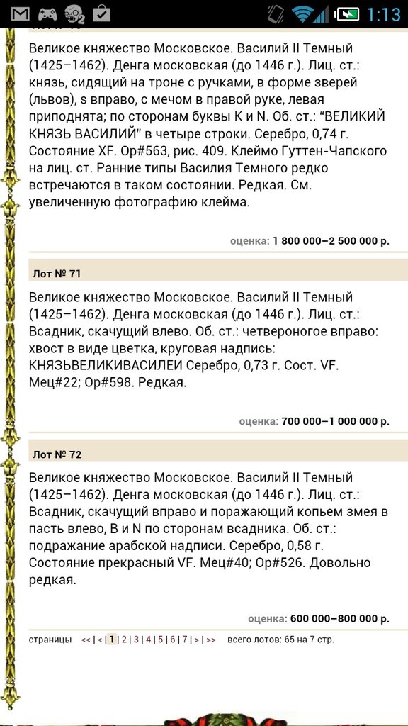QUOTE(Шкап @ May 18 2015, 15:32) Фото плохое.Что там на монете? Всадник с мечом редким не был.У меня чуть выше (на соседней стр.) зверь всадника совсем потерял. А сколько неизвестных,сразу осевших в коллекции? всадник скачущий в лево с саблей над головой, др. сторона четвероногое в право, хвост в виде цветка, надпись по кругу вот что по запросу яндекс выдает Деньга Василий Темный, Мец №22 Деньга Василий Темный, Мец №22. Лицевая сторона: Всадник скачет влево с мечом, точки вокруг. Оборотная сторона: четвероногое вправо, хвост в виде цветка, круговая легенда с именем Василия. Вес 0,702 грамма. На момент написания каталога было известно 16 экземпляров!!! Сообщение отредактировано kornysOL: May 18 2015, 23:05 Вложенные эскизы изображений |