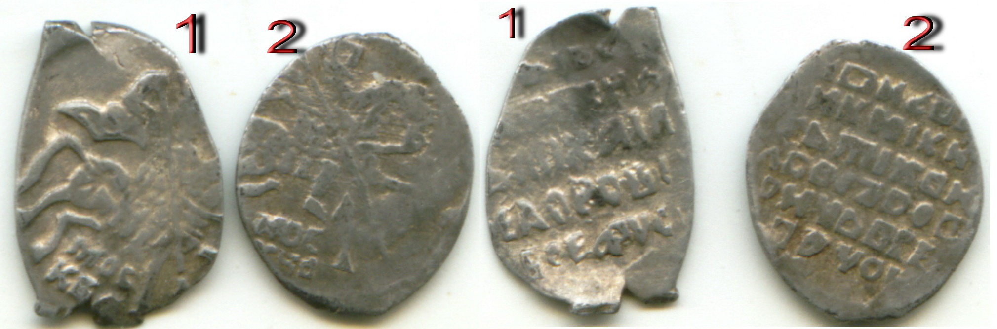 QUOTE(Алесгут @ Jun 9 2015, 15:58) Ув. ещё раз помогите по датировке монет.Копейки Ярославские? по старой нумерации: С ув. 1- КГ 331 (самая частая московская копейка) 2- вроде как это называется 819Б |