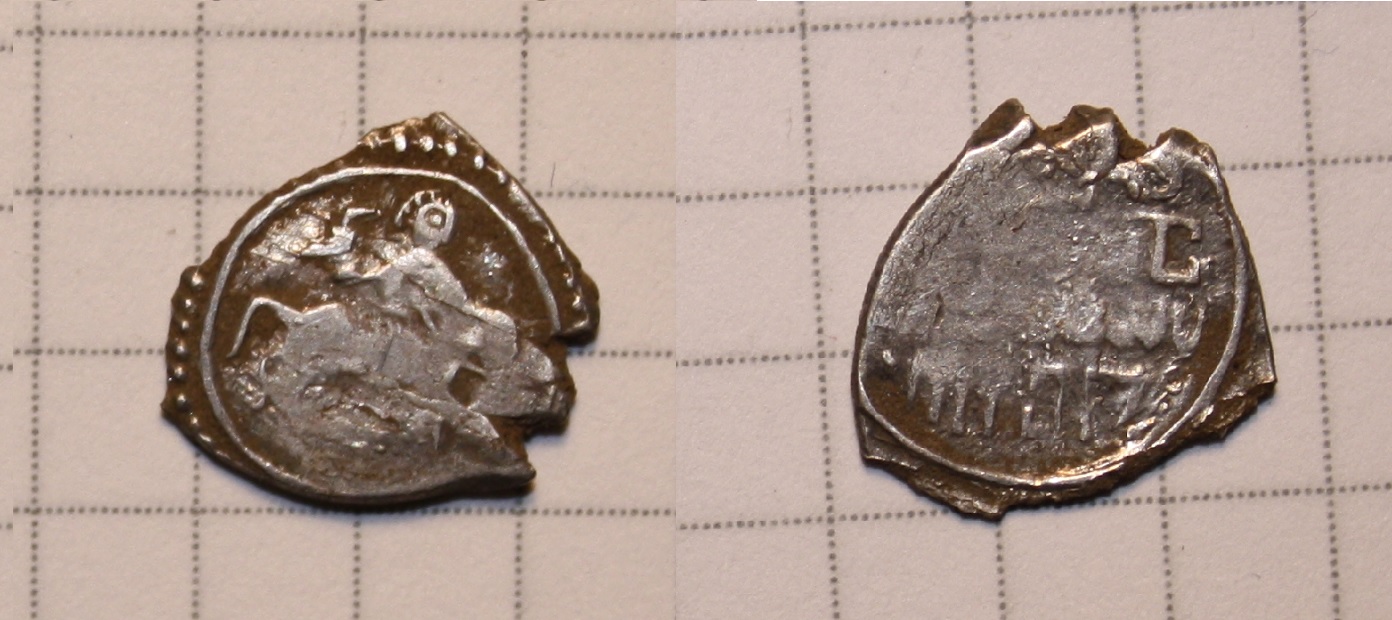 QUOTE(Dagar @ Jun 14 2015, 22:44) Добрый вечер! Помогите пожалуйста определить, ну и по возможности оценить монетку. Вес монетки: 0,94гр. (весы Китай), найдена в Нижегородской области. Заранее благодарен за ответ. С уважением. ![]() Коломенский надчекан. Гулецкий и Петрунин относят его к правлению Дмитрия Донского. |