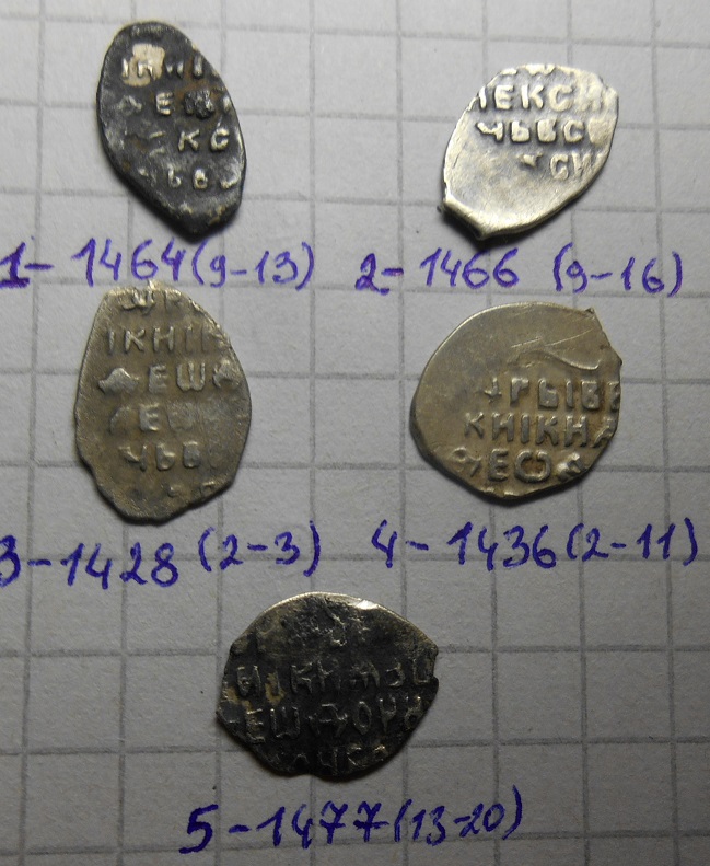 QUOTE(кто Я ? @ Nov 22 2015, 13:16) 1. Московская копеечка Федора Ивановича, КиГ 126(4-2), рядовая. 2. Псковская копеечка Федора Ивановича, КиГ 136(5-3), рядовая. 3. Псковская копеечка Бориса Федоровича Годунова, КиГ 196(3*-1), редкость IX - не совсем обычная монета, встречается реже рядовых. 4. Псковская копеечка Ивана IV Васильевича, КиГ 93(21-9), рядовая. Для состояния представленных монет стоимость составляет ~ 50+-10 рублей... -------------------- Знаешь - говори, хочешь узнать - слушай