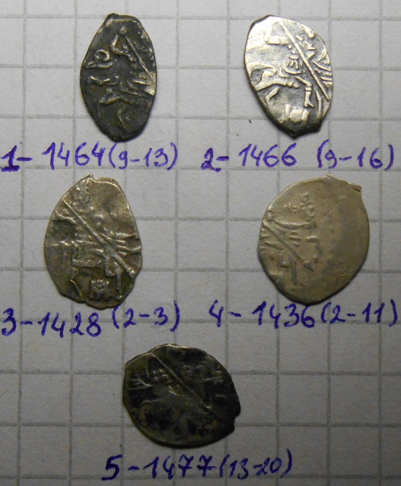 QUOTE(temkamoscow @ Nov 23 2015, 18:55) Прошу помощи в определении! Заранее Спасибо! Новгородская денга Василия 3. Московская денга Ивана 3. |