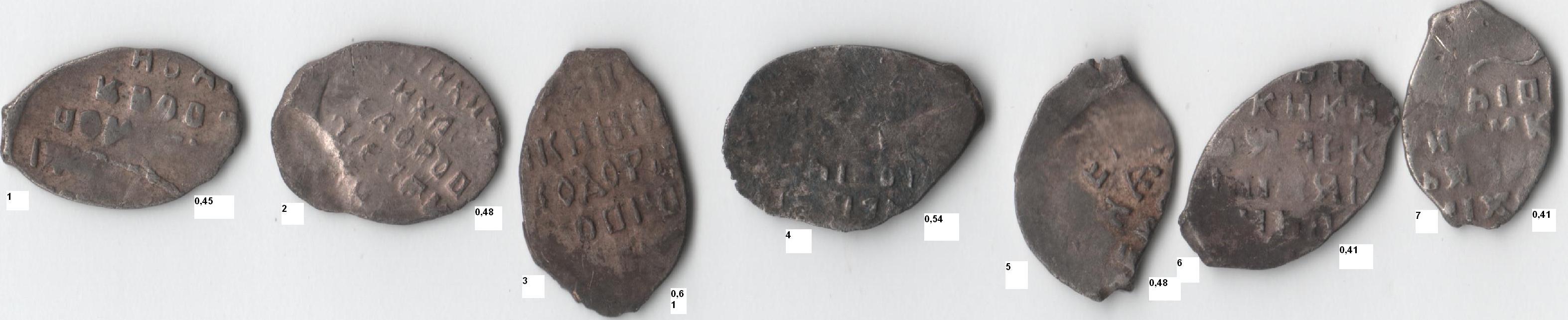 QUOTE(лугинки @ Mar 7 2016, 17:03) Помогите пожалуйста еще определить Четверица Василия 3, Полушка Грозного Иван 3 деньга московская Деньга Федора Ивановича 5,6 - Петр 1 1 - по зайцеву 136 - редкая, 3 - 5.2 по зайцеву. Сообщение отредактировано Latev: Mar 7 2016, 18:45 -------------------- Если я выиграл Ваш лот, сообщите пожалуйста в личку! Спасибо!