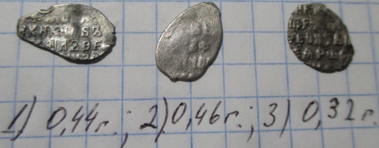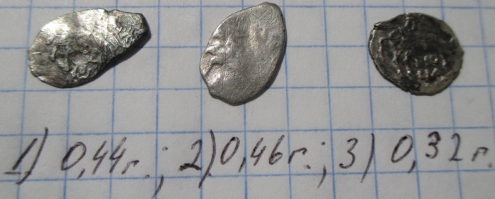 QUOTE(AlekseyRyazan @ Jun 29 2016, 23:01) Доброго вечера! Прошу помощи в определении и оценке чешуи. Заранее благодарен, Алексей. 1.Владислав Жигимонтович , КГ298, монета нечастая, но сохранность непонятная, фото получше и рублей с 200 на аукцион , может рублей 500 наберёт , может больше , как повезёт. остальные 30-50 руб. за 1шт., дороже вряд ли 2. денга Грозного 3,4. копейки Михаила Фёдоровича 5. копейка Грозного, КГ77 6. Фёдор Аексеевич, КГ1444, с двойным ударом 7. копейка единоличного правления Петра Алексеевича Сообщение отредактировано аким: Jun 30 2016, 00:44 -------------------- куплю "чешую" кучками
