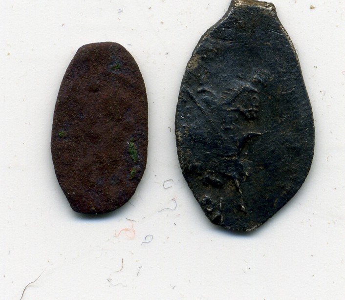 QUOTE(antimeat @ Jul 11 2016, 19:33) Подскажите по чешуйке. Вроде написано Царь Князь Василий. Рядом чешуйка медная усталая, думаю обсуждать медь нет смысла, а что по чешуйке сказать можно? Поздняя копейка Михаила Федоровича. Медь — скорее всего, копейка периода «медного бунта» Алексея Михайловича. |