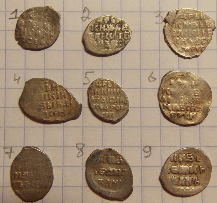 QUOTE(shanker @ Dec 13 2016, 13:27) Уважаемые , будьте добры , окиньте своим зорким оком , не силён я в них 1,3,4,5 копейки Михаила Романова 2 копейка Ивана Грозного 6 денежка Федора Ивановича все простое. цена близка к цм |