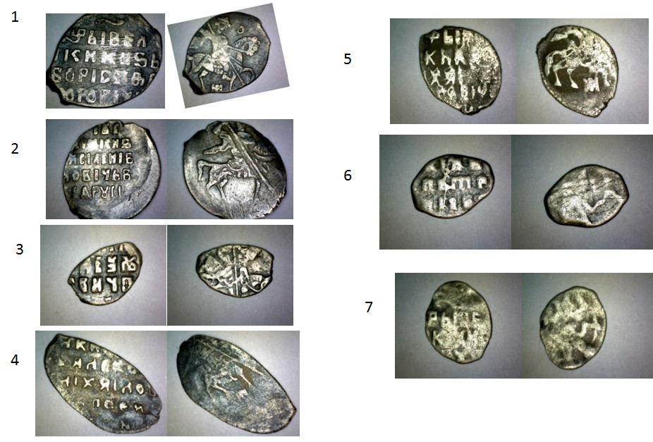 QUOTE(yamalex @ May 19 2017, 07:25) Добрый день. Помогите пожалуйста оценить чешуйки. 1 Грозный КГ93 копейка Псков 2 Годунов КГ206 копейка Новгород 3 Грозный КГ85 копейка Новгород 4 Грозный КГ63 деньга Москва 5 Грозный КГ75 копейка Новгород 6 Годунов КГ173 копейка Москва 7 Грозный Кг95 копейка Псков 8 Годунов Кг209 копейка Новгород Все довольно простое, дорогих монет нет. Можно выделить №3, на аукцион рублей с 200 я бы поторговался |