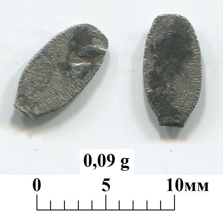 Такая интересная платежная единица лежала в куче чешуи от Ивана III до Алексея Михайловича. Вес 0,09г, гораздо меньше полушки, изготовлена по проволочной технологии. С одной стороны - видно начало "Г"(осударь) с апострофом (как у полушек Московского денежного двора), другая сторона - гладкая??