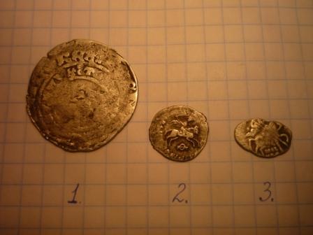 Первая - Иван IV Грозный, Новгородская копейка №75 по КГ - простейшая.