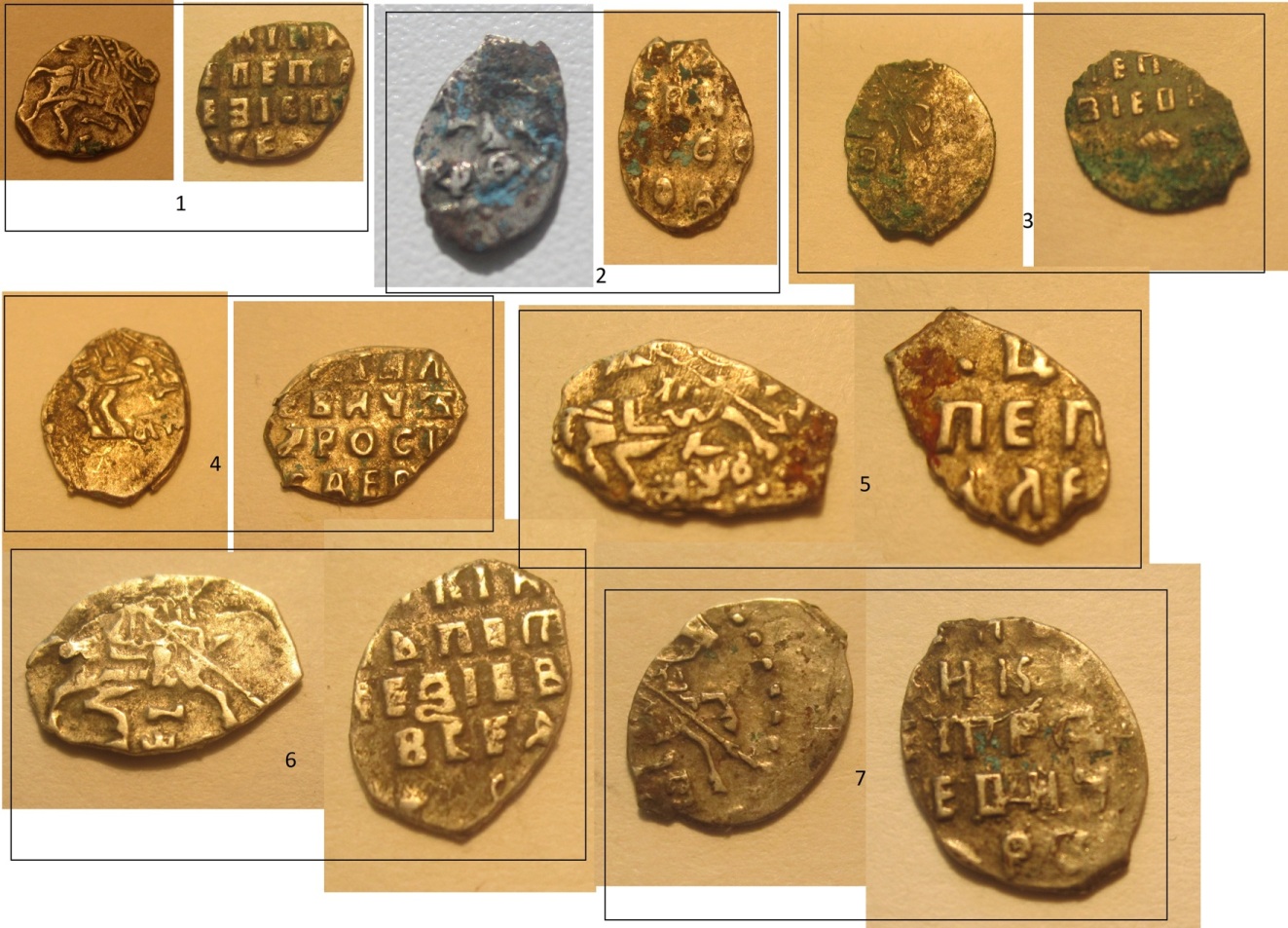 QUOTE(Панфайндер @ Oct 14 2017, 12:42) 1. Новгородская копеечка Бориса Годунова (1598-1605), КГ 209(2-2), рядовая монета. 2. Ярославская копеечка Второго земского ополчения с именем Федора Ивановича (1612-1613), КГ 303(1-1), редкость VII – не частая монета. 3 и 8. Новгородские копеечки Бориса Годунова, КГ 173(4-2), рядовые. 4. Московская копеечка Бориса Годунова, КГ 167(2*-2), редкость VIII – не частая монета. 5. Псковская копеечка Василия Шуйского (1606-1610), КГ 265(1*-1), рядовая монета. 6. Московская копеечка Ивана IV Васильевича (1533-1584), КГ 87(15-8), рядовая. 7. Московская денга Ивана IV Васильевича, КГ 61(12-15), рядовая. 9. Новгородская копеечка Бориса Годунова, КГ 220(6-5), рядовая монета. 10. Московская копеечка Владислава Жигимонтовича (1612-1613), КГ 296@(3*-2), редкость IX – не совсем обычная монета. Сообщение отредактировано Tanais: Oct 14 2017, 14:59 -------------------- Знаешь - говори, хочешь узнать - слушай