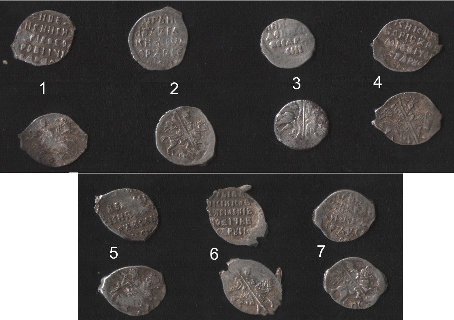 QUOTE(AAAaaa @ Dec 17 2010, 15:33) Может кто подскажет по чешуе? Интересует атрибуция 1,4 Борис 2,5,7 Фёдор Иванович 3 Грозный 6 Шуйский -------------------- новый каталог по царской чешуе