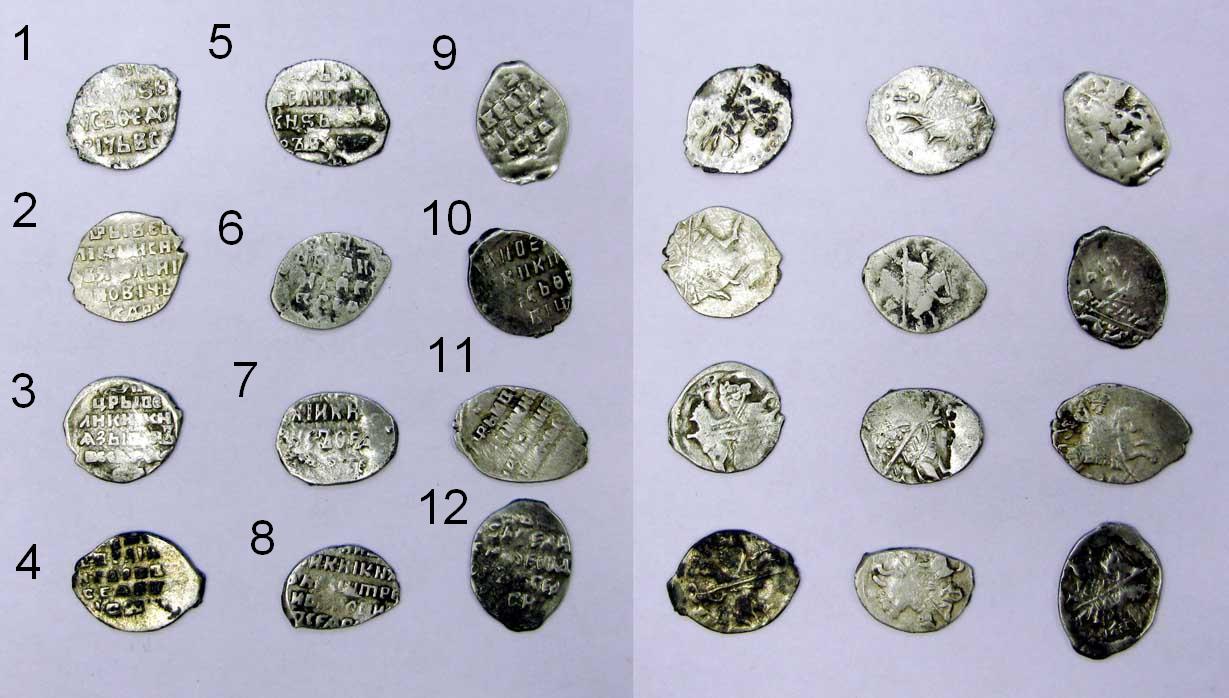 3,4,6,9 - Иван Грозный; 5,12 - Федор Иванович; 1,7,10 - Борис Годунов; 8 - Дмитрий Иванович; 2,11 - Василий Шуйский. №11 - очень редкая монетка.