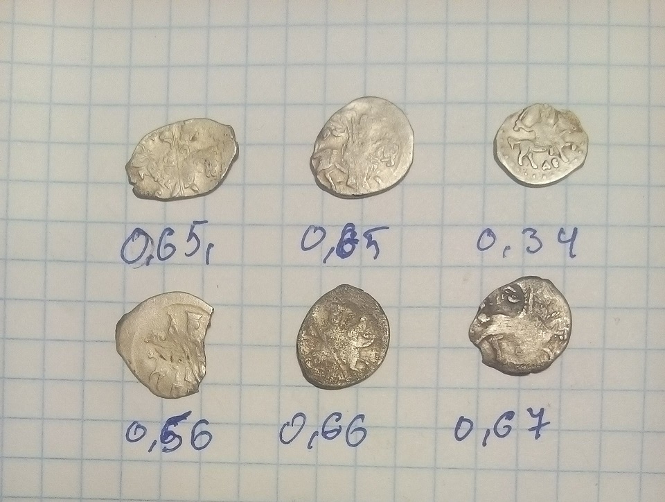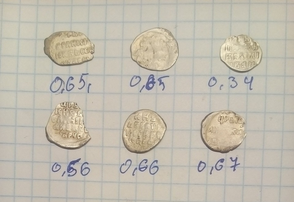 QUOTE(даждьбог @ Dec 3 2017, 13:26) Добрый день.подскажите что за чешуйки и по цене . Верхний ряд слева, видится копейка Федора Ивановича. Справа, деньга Ивана Грозного. В центре - инкузный брак (залипуха), виден только всадник, оборотка не читается. Нижний ряд - копейки Ивана Грозного. По цене 50-100 руб. за монетку. -------------------- В этом мире нет тайн, есть только скрытая правда - правда, таящаяся в глубине.