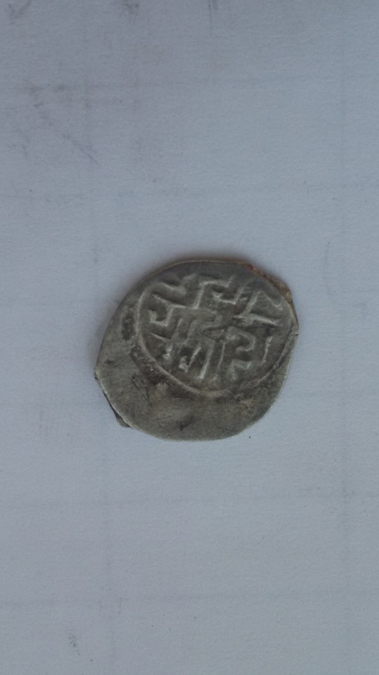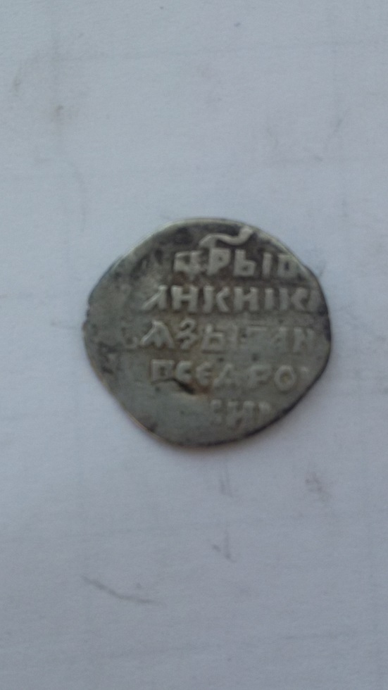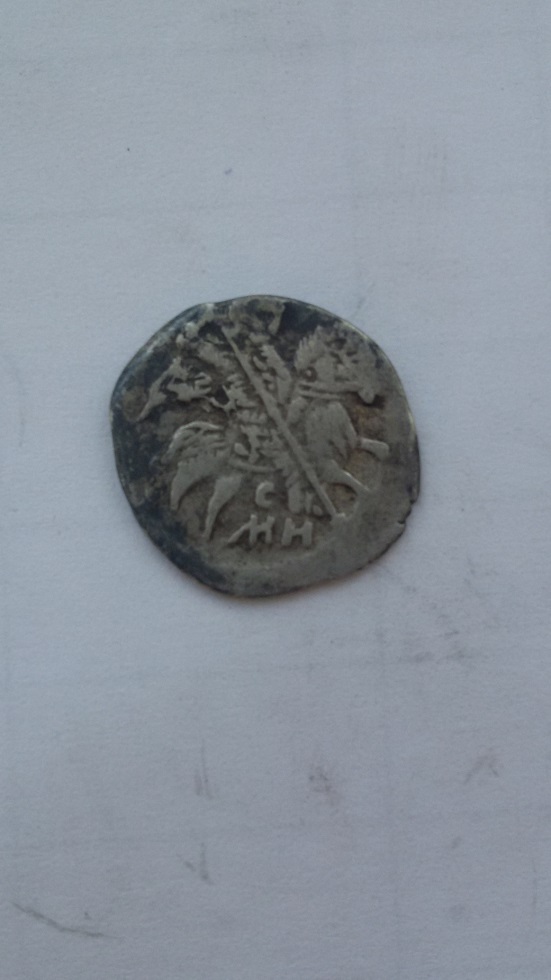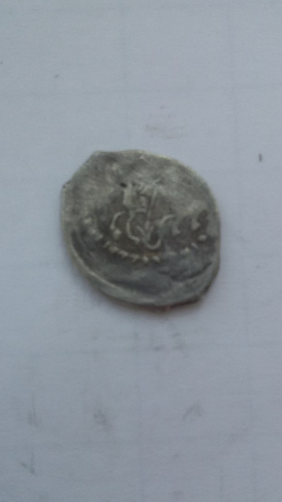 Фальшивая удельная монета в ущерб обращению. Из под слоя серебра проглядывает медь. Вес 0,6 гр.
