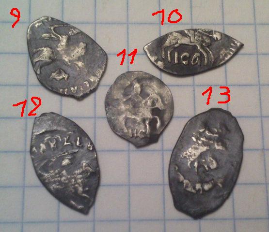 Здравствуйте,подскажите пожалуйста по монеткам,определение и оценка регион находки Ряз обл,заранее спасибо! 1-0,63 2-0,60 3-0,57 4-47 5-0,54 5-0,64 6-0,58 7-0,59 8-0,41 9-0,54 10-0,33 11-0,25 12-0,45 13-0,58