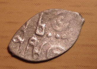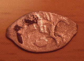 Пытался определить по КГ данную монетку, но мне она кажется какой то подозрительной, особенно меня смущяет расположение ноги по отношению к копью, по каталогу нога везде плево от копья, а на моей справо. А может я просто не туда смотрел?
