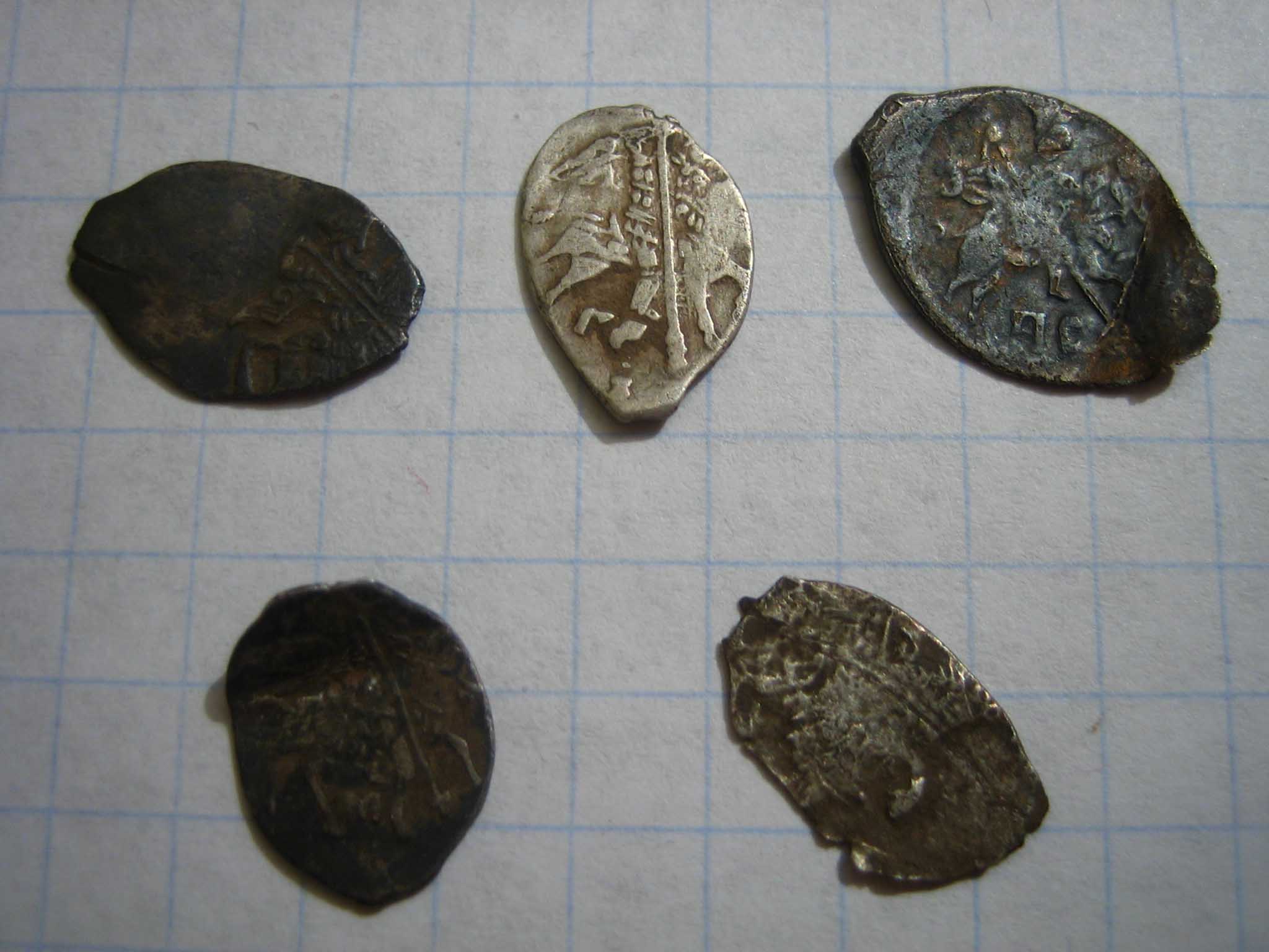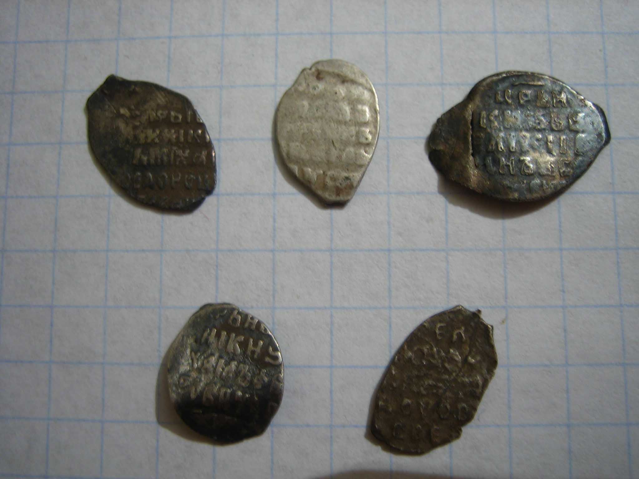 QUOTE(пират @ Feb 2 2011, 23:10) Добрый вечер. Посмотрите - чьих будут монетки? В чешуе знаний - присутствие полного отсутствия. Спасибо. Первая и нижний ряд - Михаил Фёдорович, остальные Грозный. |