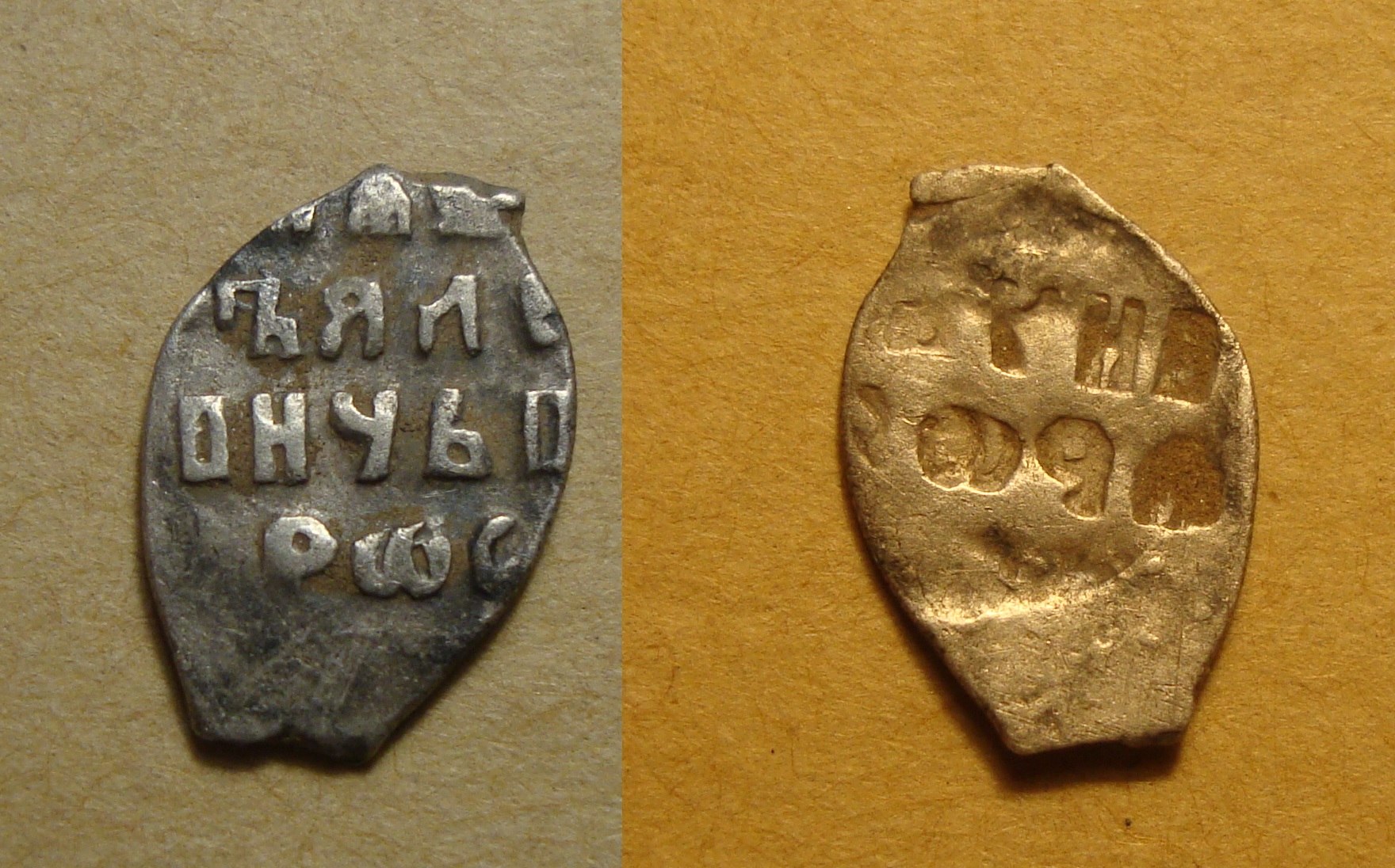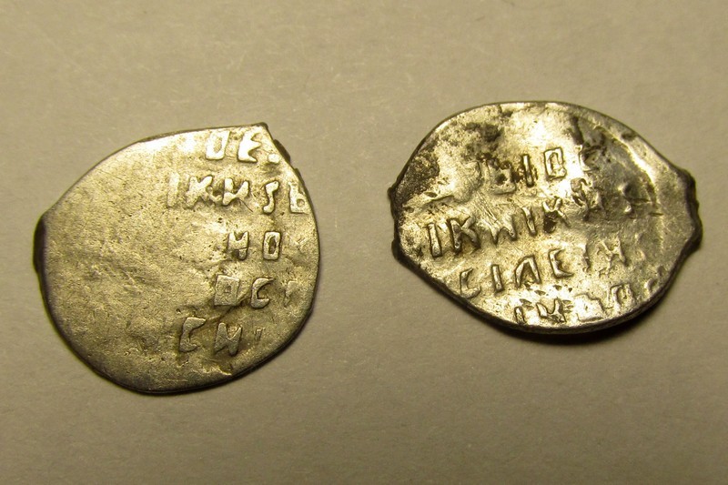 1. Какая-то интересная копейка с именем Михаила Фёдоровича. Надо разбираться... Алексей Михайлович, КГ 1293 VII ст. редкости, по ГКХ имеет номер 2590 VI ст. редкости. |