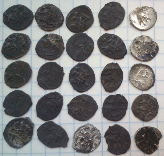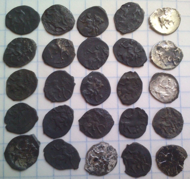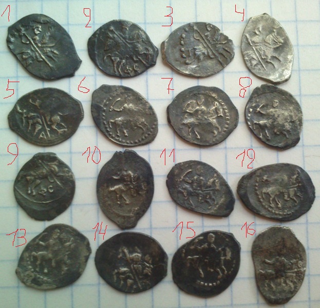 Добрый вечер,уважаемые специалисты, помогите,пожалуйста, определить и оценить чешуйки. Регион находки: Ярославская область. Вес: 1-ая: 0,63 г.; 2-ая: 0,65 г. 1) Федор Иванович, КГ 126, двойное соударение, для любителей подобных браков, рублей 50+- 2) Иван Грозный КГ 87, без степени редкости, 50-100 руб. |