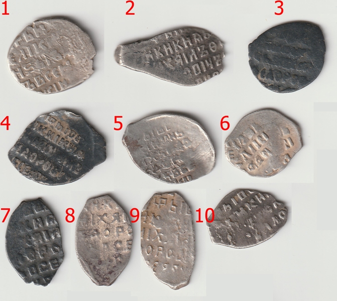 QUOTE(stas_br @ Feb 1 2019, 22:02) Добрый вечер. Подскажите, нет ли среди этих монет более или менее интересных. Заранее спасибо. 1 - КГ85(R9) 2 - КГ602 3,4 - КГ331 5 - КГ407 6 - КГ61 7 - КГ626 8 - копейка Михаила Федоровича (о.с. 31) 9 - КГ578(R7) 10 - копейка Алексея Михайловича (возможно КГ1000) -------------------- Куплю комплексы чешуи 3х рублевой монетной стопы (от Ивана Грозного)