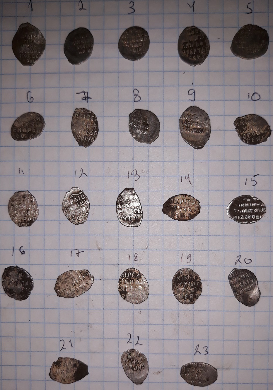 QUOTE(The Black Rider @ Mar 26 2019, 02:54) 1 - шведы в Новгороде ,КГ 325 (если вес около 0,55, что скорее всего); 2 - Федор Иванович, Москва, 126; 3,4,7 - Михаил Федорович, Москва, 331, 415, 367; 5,6 - Грозный, 79, 89; 8 - Василий Шуйский, Москва, 252. Огромнейшее Вам спасибо за ваши труды в определении монет. С уважением, Александр -------------------- Кто ищет, тот всегда найдет!