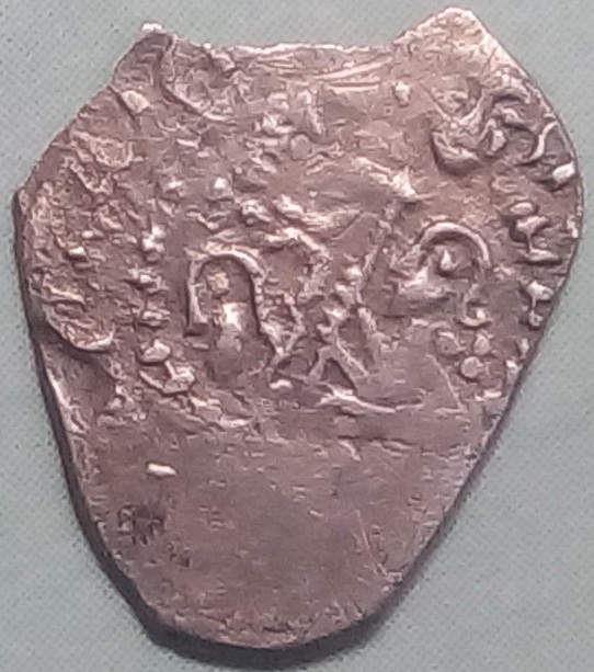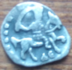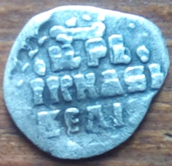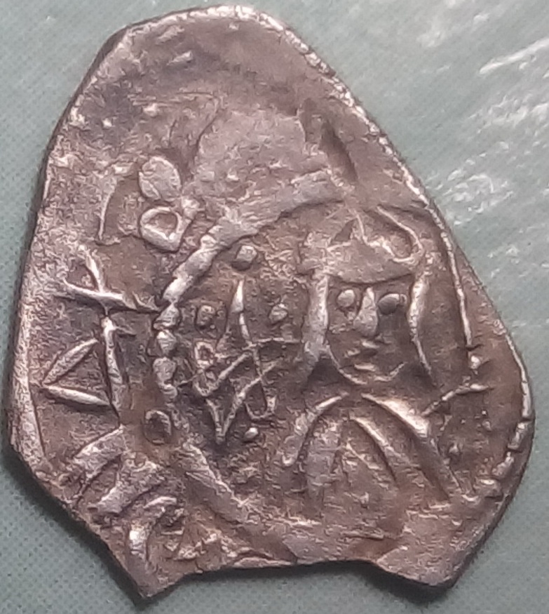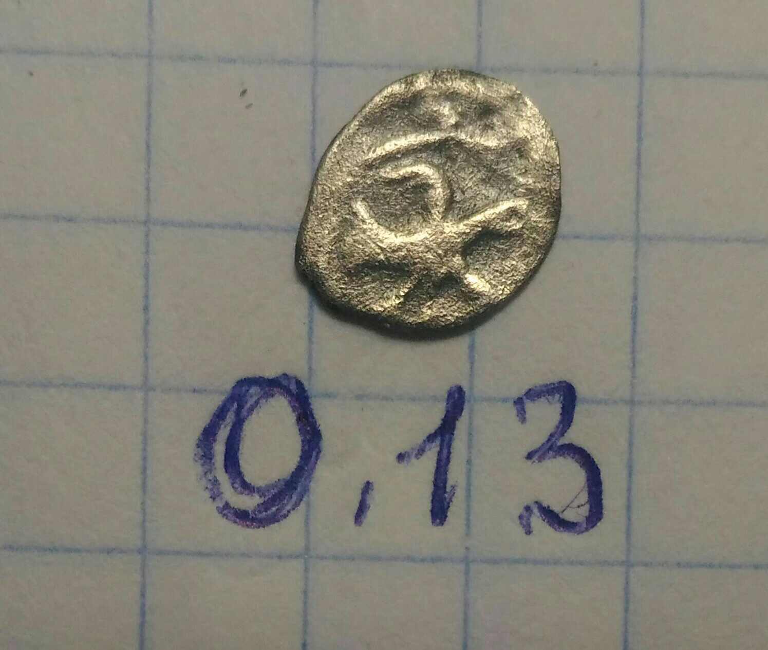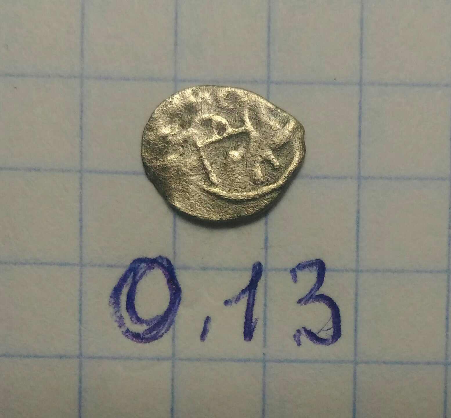 Если не ошибаюсь тип с кружками за спиной князя,у просителя овальный предмет в руках. А вот на обратке идет точечное обрамление легенды. Я такого штемпеля на этом типе не нашел. пособите у кого знания есть, спасибо. вес 0.58 г |