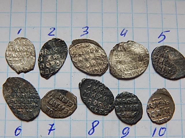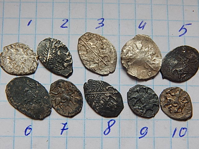 QUOTE(олег-ч @ Sep 30 2019, 16:28) Доброго времени. Подскажите по чешуйкам-определение и оценка. Заранее благодарю. 1 - деньга Федора Иоанновича, 2,6,8 - московские копейки Михаила Федоровича, 3 - московская копейка Бориса Федоровича, 4 - копейка Грозного, 5 - шведская оккупация Новгорода, 7,10 - тверские денежки Грозного, 9 - его же московская денежка. (КГ: 105, 482, 173, 77, 327, / 415, 67, 482, 60, 67 ). Все из самых частых , оценивать особо нечего , 40-50 рублей штука; может, разве Годунов и швед в Новгороде к 100р ближе. |