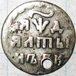Алтынник Петра I 1704 год, состояние хорошее по Конросу 175 у.е. но какой-то ур.. просверлил в нем дырку (ушко). Рядом с ним бsли найдены медные монеты от Лизы до Александра I