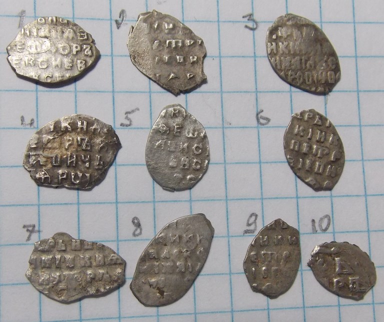 QUOTE(MARGI @ Sep 16 2020, 16:51) 1,5 - Федор Алексеевич, 2,4,6,9 - Петр, копейки Старого двора 1696-1704гг, 10 - он же, Кадашевский двор, 1702 или 1703г, 3 - московская копейка Михаила Федоровича, 8 - Алексей Михайлович. 1,5 - рублей по 100, остальное 30-50р штука. |