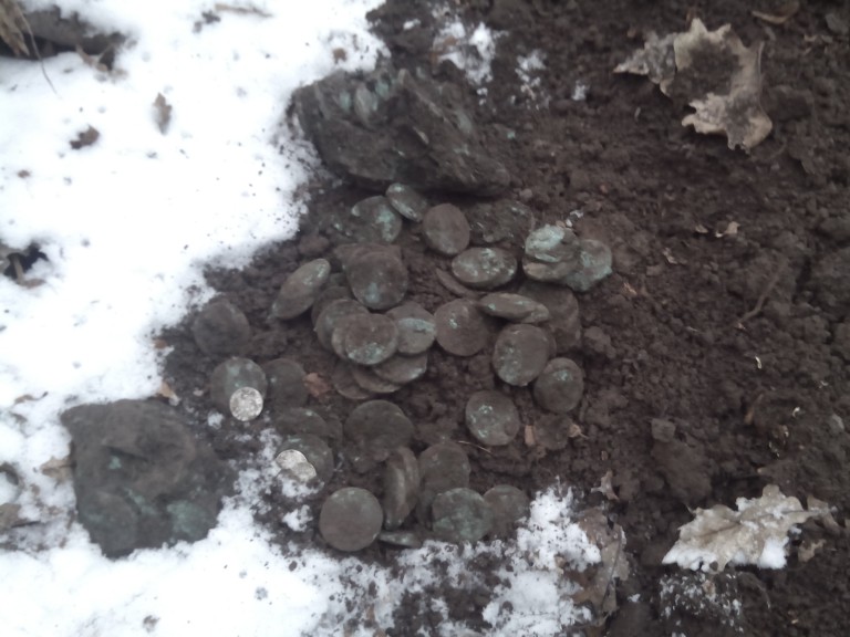 Аккуратно подкопал лопатой, стал горстями вместе с землёй доставать пятаки. Встав , разогнув затёкшую спину, закурил В голове бегали мысли:кошель или клад? Оглядев кучу пятаков понял, что нашёл клад. Слишком тяжёлый был бы кошель. Чувство радости переполняло меня. Я не прыгал, не кувыркался, но чувство-неописуемое! Докурив сигарету, Нырнул опять в яму-стал добирать остатки, а в голове крутилось: а где же серебро? Добирая последнею медь, надежда найти серебро угасала, и вот что то блеснуло. На дне ямы-залипуха серебряных и медных монет. Серебра оказалось 4 монеты.