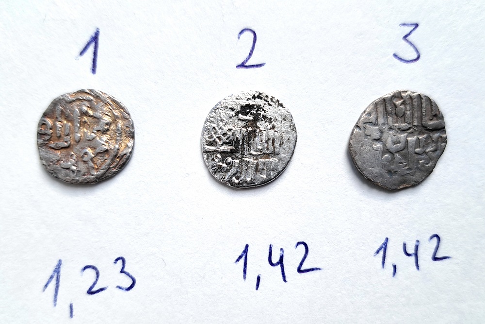 QUOTE(lowkiy @ May 26 2024, 22:33) Прошу определить и оценить монеты. Вес 1,21 гр., 1,2 гр и 1,18 гр.. Заранее спасибо! 1. Пулад Хаджи-Тархан от 1000р 2. Шадибек Орду аль Джадид до 700р 3. Пулад Хорезм до 1000р. Оценка очень примерная. -------------------- СаД - Сарай аль Джадид