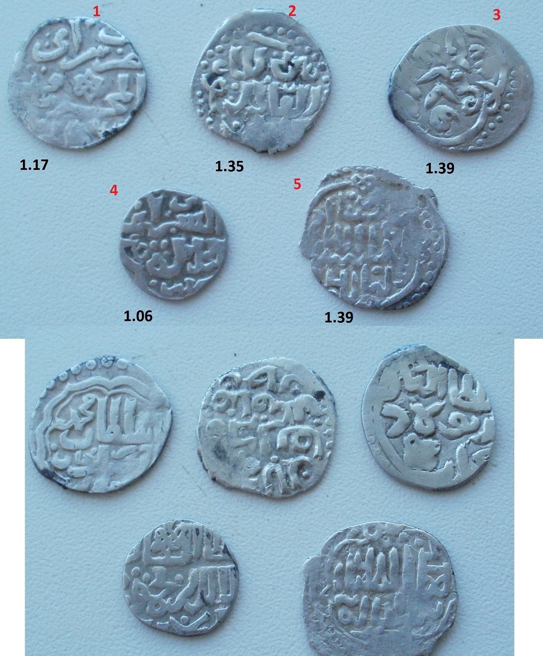 QUOTE(финфадик @ Jun 17 2012, 11:05) 1. Узбек. Сарай ал-Махруса. Частая и сохран слабый. 2. Красивое русское подражание. 3. Бек Пулад. Орда. Тоже хорошая монета. 4. Джанибек. Сарай ал-Джадид. Обрезана в 14 – 15 веках. Не интересная во всех отношениях. 5. Красивое подражание. Интересное во всех отношениях. -------------------- Специализация: джучидские данги от Тюляка до Ибака.